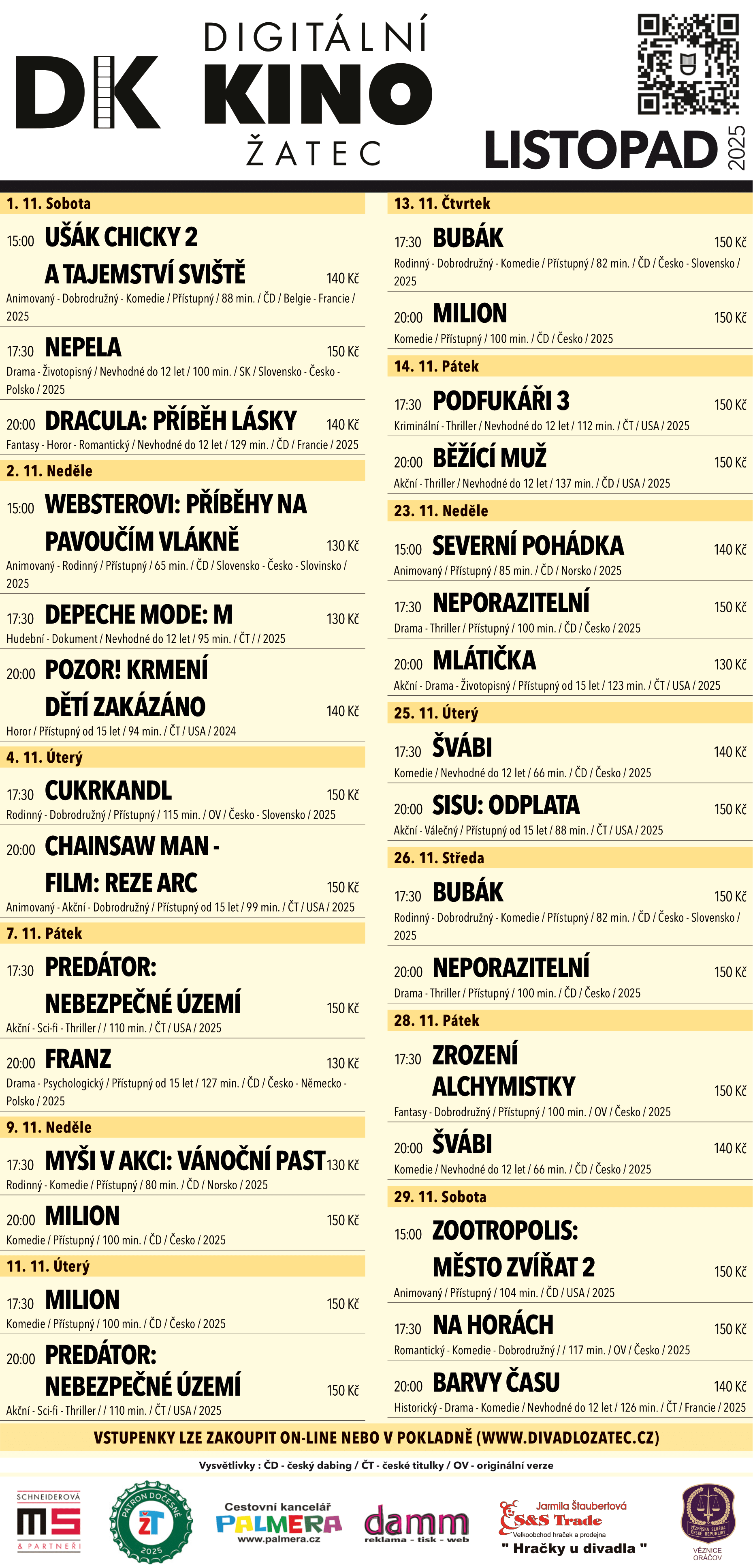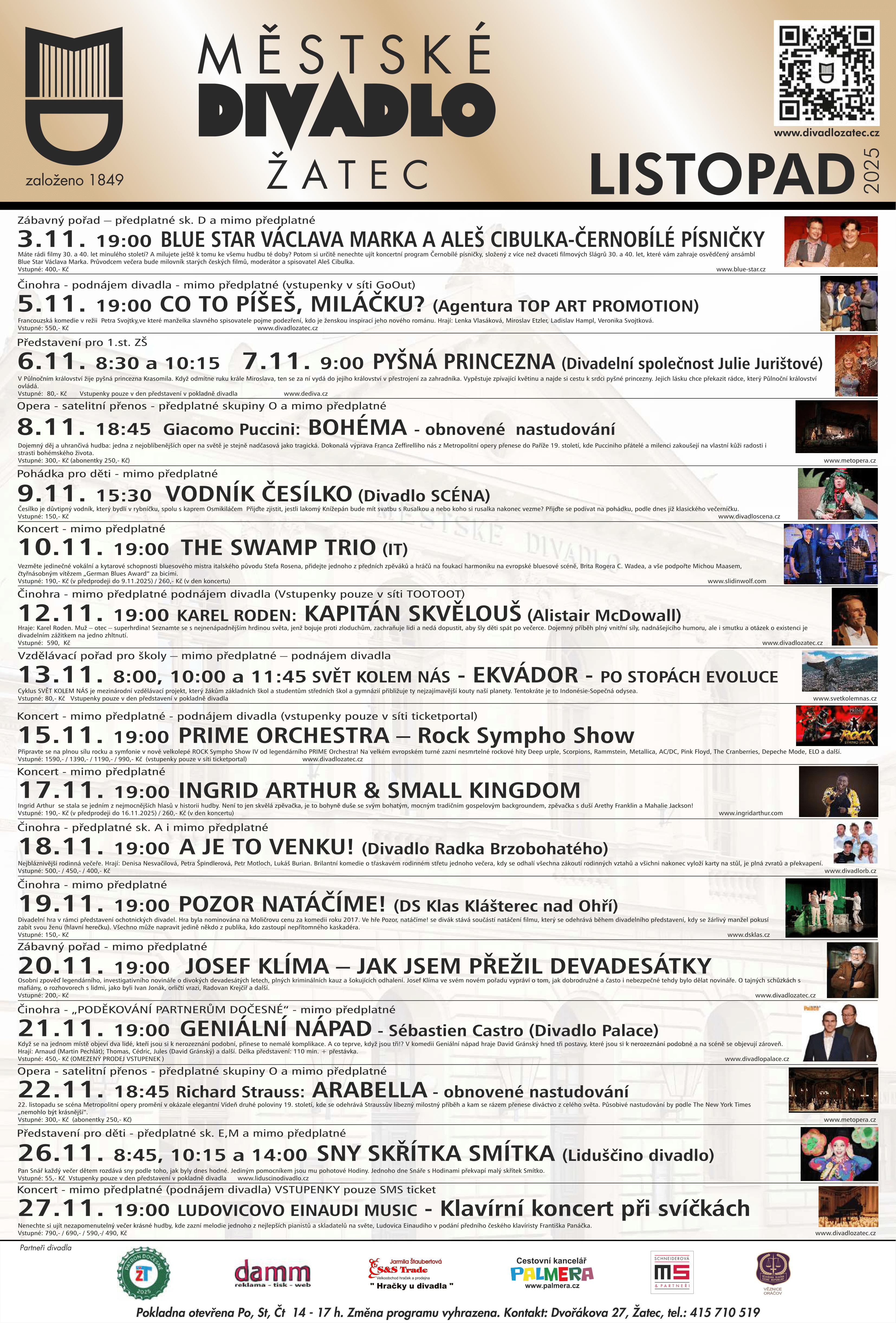 Program Městského divadla listopad 2025 ke stažení ZDE, program Digitálního kina ke stažení ZDE.