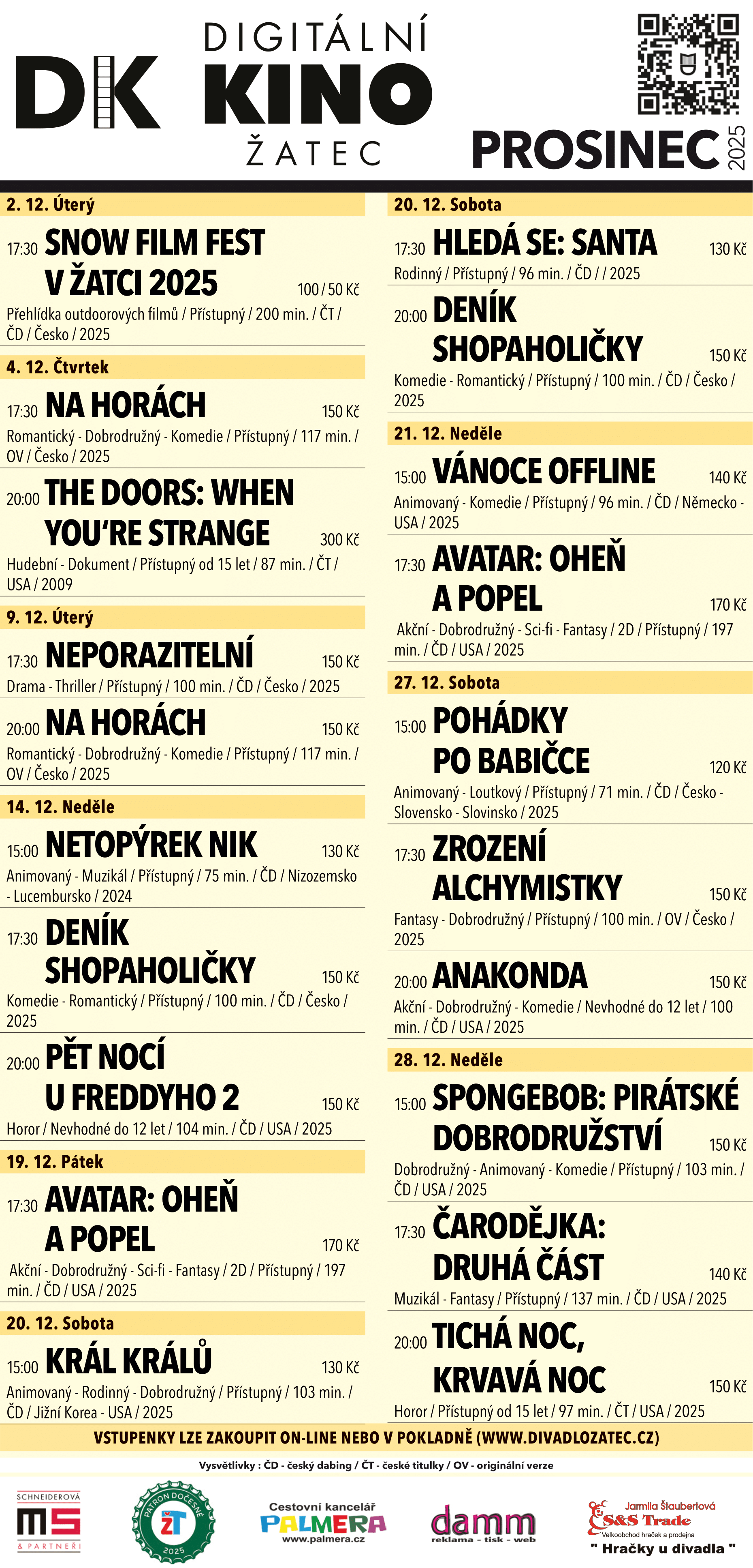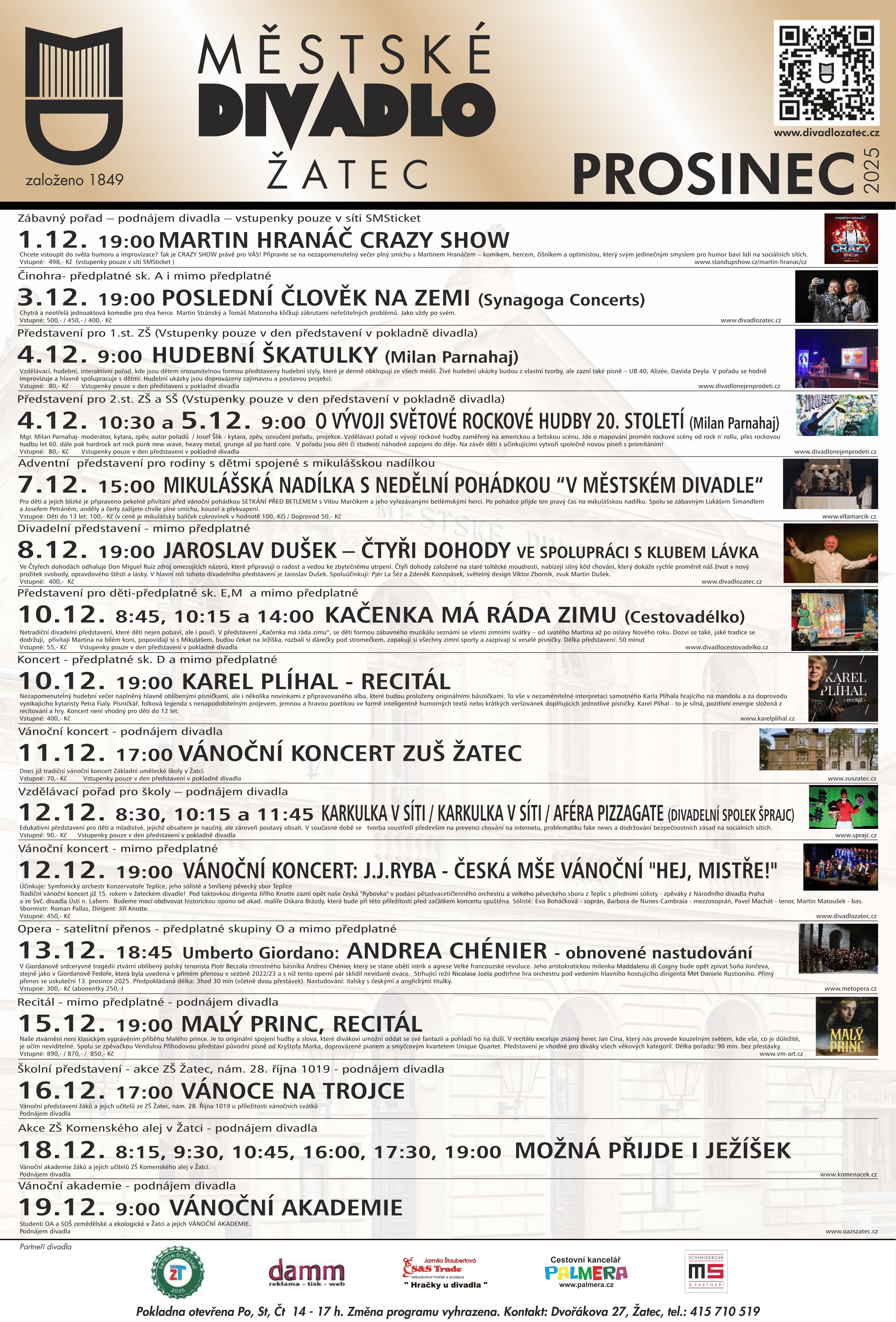 Program Městského divadla prosinec 2025 ke stažení ZDE, program Digitálního kina ke stažení ZDE.