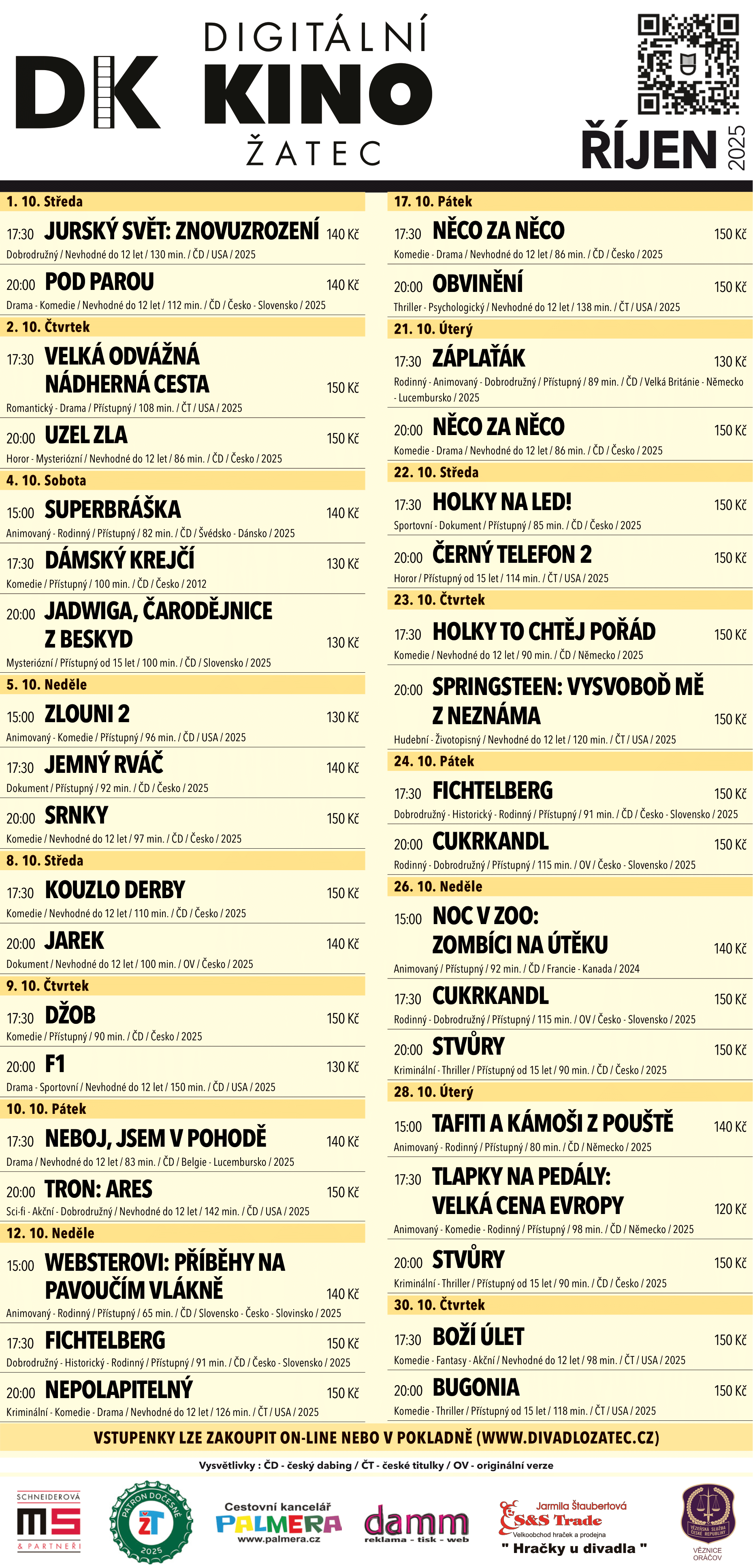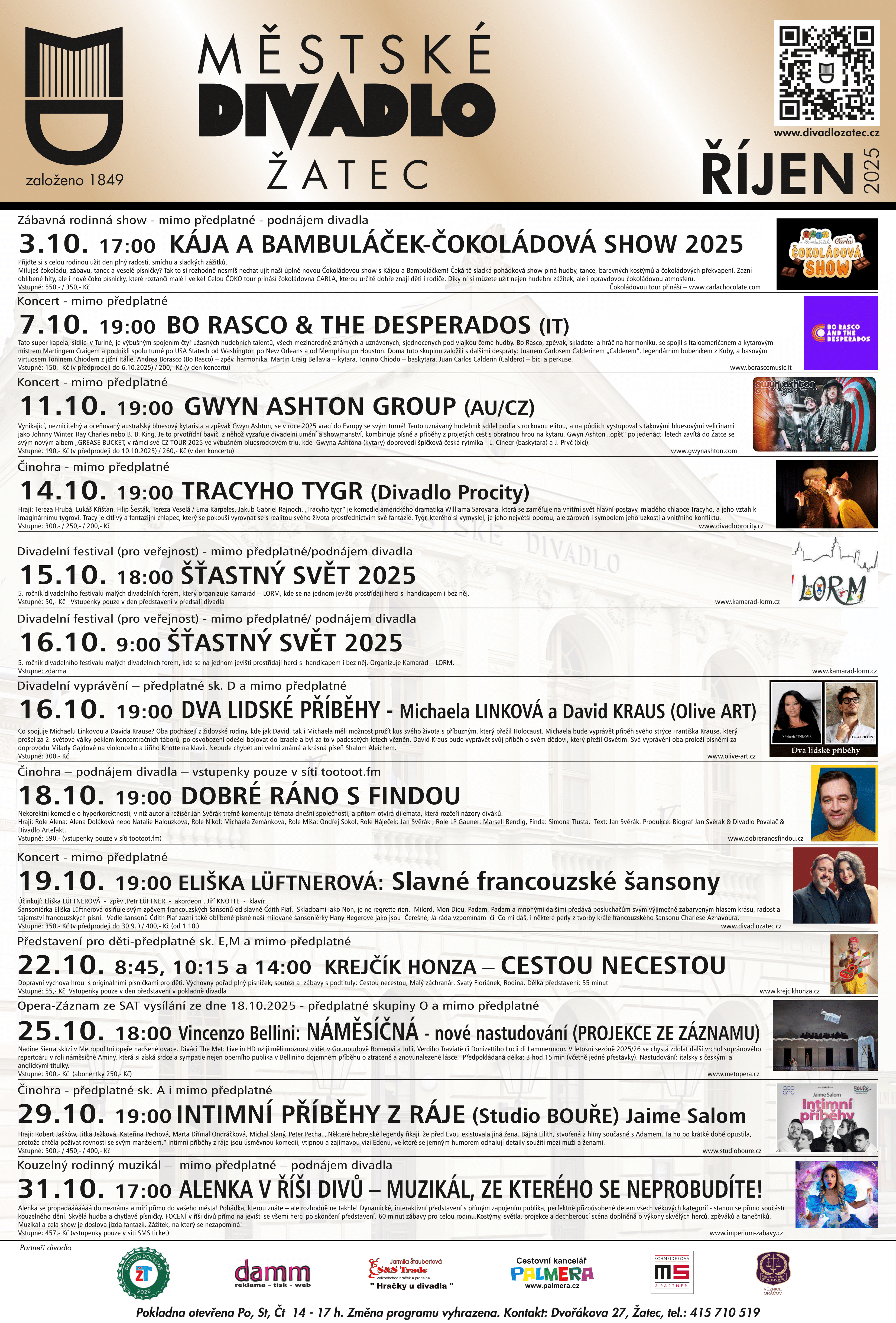 Program Městského divadla říjen 2025 ke stažení ZDE, program Digitálního kina ke stažení ZDE.